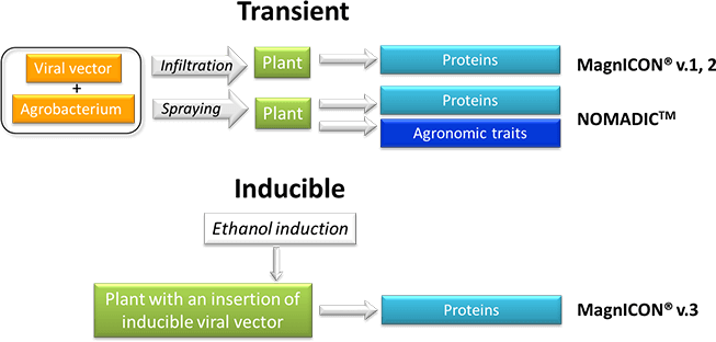 NOMADIC™ and magnICON® v.1, 2 are proprietary technologies based on a transient process instead of transgenic plants. They provide for high speed of product development and manufacturing, as well as lowest capital and running costs typically associated with agricultural commodity products. The technologies are compatible with existing plant agronomy, they have no fixed throughput components which allows for late product choice decision. The technologies were tested with several hundred proteins including difficult to express molecules. Protein yields achieved with our platform reach theoretical expression limits. Use of green biomass instead of seed provide for better acre utilization.